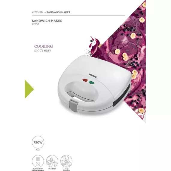 Whether it's a quick weekday lunch or a lazy weekend, the SMP01 can make a range of great tasting hot meals in minutes. The SMP01 features a combination of grill griddle plates and deep fill sandwich plates so that you can pack your toasted sandwiches or simply grill a variety of foods. Feature Plastic 2 in 1 Sandwich Maker 2 Sets of multi-functional plates for grilling and toasted sandwiches Removable, Non-stick plate for easy cleaning The temperature indicator light for optimal results White housing 220-240V 50Hz 750W-UK plug Thermostatically Controlled Safety thermal cut-out and thermal fuse Specification Special features: Non Stick Coating Color: White Brand: Kenwood Power / Wattage: 700 watts