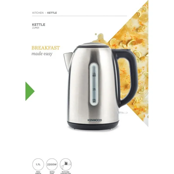 The Kenwood Stainless Steel Kettle (ZJM01.AOBK) is a 1.7L cordless electric kettle designed for efficiency and style. Featuring a 2200W rapid-boil element, auto shut-off, and a sleek stainless steel finish with grey accents, it combines powerful performance with a premium look suitable for any modern kitchen.