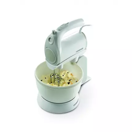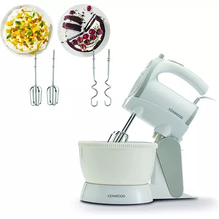 The world famous Kenwood chef range comes with an elegant and compact hand mixer with bowl offering powerful 300 watts motor for fast and efficient mixing. This mixer with 5 dedicated speeds for mixing and whisking and a turbo function for folding. It comes complete with stainless steel beaters and kneaders to ensure all your ingredients are mixed well. This unit saves busy cooks time and effort as the combination of the driven bowl and beater rotation achieves a thorough mix without any unnecessary mess. It features a simple thumb operated speed control button. The beaters have an interlock system for safety and security. Feature 300 watts motor with enhanced cooling system for fast efficient mixing 2.4l rotary bowl with automatic bowl rotation for easy and efficient mixing 5 speed + turbo for folding, mixing and whisking & eject function Stand + bowl for dual functionality Non-degradable stainless steel beaters for added durability and strength , kneaders for your doughs Specifications Brand: Kenwood Colour: White Material: Stainless Steel & Plastic Power: 300w