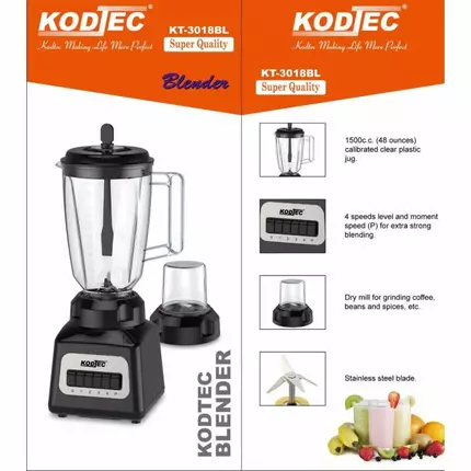 Blender 2 in 1 Easy to Get Juice with Great Texture : Equips with a 350W pure copper motor and 4 sharp, long-lasting stainless blades. Perfect for fruit and vegetable juices. Easy to Disassemble and Clean the 1.5 Land 50 grams Plastic jars can be separately washed. Safe and Secure : Kodtec Blender equipped with overheating protect on system. Multi functional blender 1.5 L UNBREAKABLE plastic jar perfect for blending juices and 50 gram plastic jar perfect for grinding dry spices, dry nuts and coffee. Easy to Control: 4 Variable Speed Controls and Pulse feature let you manually fine - tune the texture of any recipe. Efficiency :Kodtec Blender blends and grind at multiple levels to improve efficiency and blending power with power supply of 220-240V 50/ 60Hz