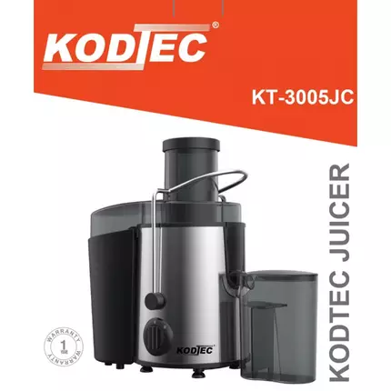 JUICER EXTRACTOR • Kodtec Juice Extractor For All Kinds Of Fruits and Vegetable • Pure Copper Motor Sus430 Net. As. Abs And Sus201 Housing. • Overheating Protection, 2 Speed Plus Pulse Control, Non-slip Mat, detachable Parts • Capacity :juice Cup : 450ml Pulp Container: 1500ml • Model : Kt-3005jc • Power Consumption : 400w • Voltage : 230v • Frequency: 50hz • Electric Urrent: 1.739a • Capacity. Juice Cup : 450ml Pulp Container: 1500ml • 230v / 50hz, 400w, 7025 Roller Motor