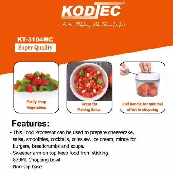 This Food Processor can be used to prepare cheesecake, salsa, smoothies, cocktails, coleslaw, ice cream, mince for burgers, breadcrumbs and soups. Sweeper arm on top keep food from sticking, With 870ML Chopping bowl