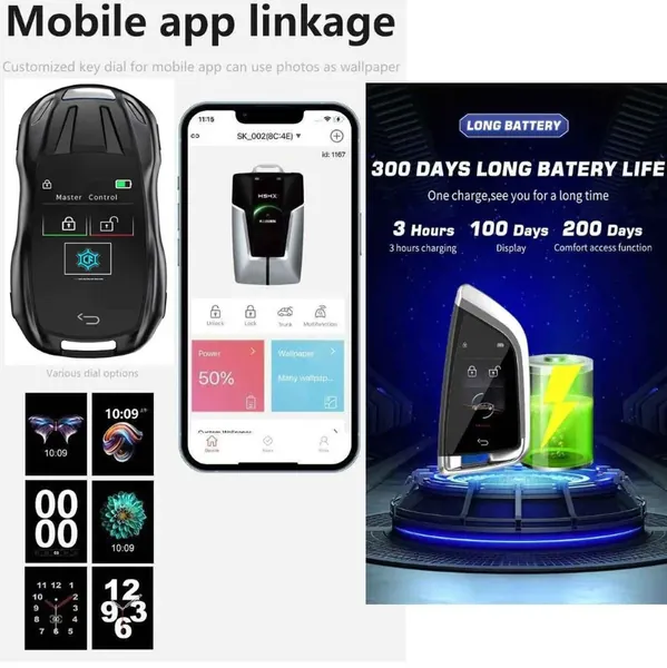 COMPATIBLE WITH AUDI BMW MERCEDES JAGUAR RANGE ROVER PORSCHE VOLKSWAGEN SKODA VOLVO NISSAN JEEP MARUTI TOYOTA HYNDAI KIA MG FERRARI LAMBORGHINI FORD MINI COOPER LCD LED KEY LCD SMART CAR KEY MULTI LANGUAGE EQUIPPED WITH MECHANICAL SPARE LCD LED SMART KEY ENTRY LOCK UNLOCK CAR KEYS WITH MOBILE PHONE APP FUNCTION