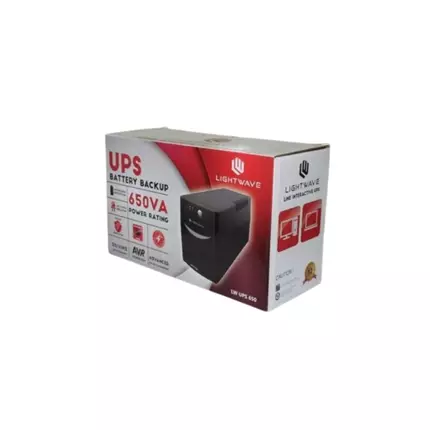 Lightwave 650VA UPS. It is efficient and durable, features a boost and buck AVR, three LED indicators for easy monitoring and it is fully digitized microprocessor controlled. Lightwave 650VA UPS are systematically and carefully engineered to offer discerning customers enhanced power availability which is built on well-tested and reliable technology. Lightwave 650VA UPS offers very high value to its diverse customers in different applications. It has a capacity of 650VA. Uses an internal battery that is 12v and 7ah. It offers high/low voltage protection, as well as overload/short protection. Lightwave 650VA UPS is completely automatic, with intelligent battery management. The internal battery can be replaced by a genuine 12v 7ah battery. The Lightwave 650VA UPS can be used to power low consumption electrical appliances such as office printers, routers, computers, and everyday items found in the office. It is not suitable for high power consumption accessories such as heaters, or water dispensers. Features: LED display High/Low voltage protection Overload / short protection Intelligent battery management Auto charge function Specifications: Brand: Lightwave Model: 650VA Type: UPS Capacity: 650VA Color: Black Nominal Input Voltage: 230V Input Frequency: 45 – 65 Hz Input Connections: IEC-320 C14 Cord Length: 1.16 meters Input voltage range for main operations: 140 – 300V Maximum Input Current: 7A Input Breaker Capacity: 7.0 A Output Power Capacity: 390 Watts / 650 VA Max Configurable Power: 390 Watts / 0 VA Nominal Output Voltage: 230V Efficiency at Full Load: 97.0% Output Frequency (sync to mains): 50/60Hz +/- 3 Hz Topology: Line Interactive Waveform Type: Stepped approximation to a sinewave