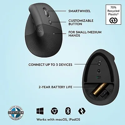 When the desk life gets you down, lift yourself up. A great fit for small to medium hands, the Logitech Lift Vertical Ergonomic mouse is crafted for comfort from first light to late night. Raise your hand into instant comfort with a soft rubber grip and cozy thumb rest. Realign into a more natural posture at 57 degrees. And feel focus flow from morning to night with productivity features designed to suit your working style. Connect easily to up to three devices via Bluetooth or Logi Bolt, and enjoy up to 2 years of battery life on a single AA battery.
