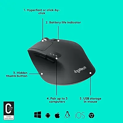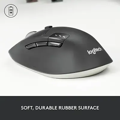 The Logitech M720 Triathlon wireless mouse features superior device connectivity with the ability to connect via both USB port and Bluetooth. The sculpted, ergonomic construction ensures comfortable use and puts the scroll wheel and buttons within easy reach. For even more personalized flexibility, the buttons are fully customizable. Simply press one button to effortlessly switch between three different computers without having to change any connections. To reduce office waste, this mouse can last as long as 24 months on one AA battery.