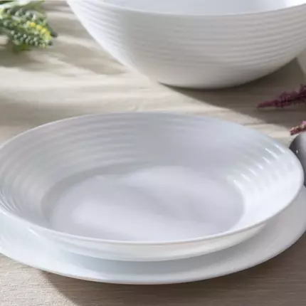 The Harena Soup Plate has been inspired by the rings of a circus, with tiered seats on the rim, the Harena collection brings the carnival spirit to your family table. The rings create a lively design that undercuts the austere look of the immaculately white opal.