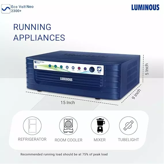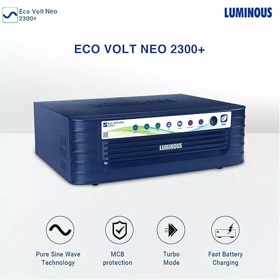 Eco Volt Neo is a pure sine wave UPS with features such as Intelligent Water Level Indication which helps consumer to track battery water level hassle-free, low harmonic distortion makes inverter practically noiseless. Pure sine wave output makes it highly efficient and saves electrically bills. Inverter Type: Pure Sine Wave, Capacity: 24 Volt, Rating: 2000VA, Maximum Peak Load: 1600 Watts Running Load : 1 TV+ STB, 3 CEILING FAN, 4 LED BULB, 2 TUBELIGHT, 1 Refrigerator, 1 laptop, 1 Mixer Grinder Turbo mode for better performance: The Turbo Mode Inverter provides stable power output up to 230V, protecting against fluctuations and surges. With its compact design and energy-saving features, it's the reliable choice for uninterrupted power supply. Charging Current Selection: Optimize your charging experience with our Charging Current Selection. Set the perfect charging current, up to 20 A, for your electronic devices with ease and confidence Inverter Mode Selection: The Inverter Mode Selection technology offers the choice between unregulated and regulated power output. Effortlessly switch between modes to optimize energy usage, extend battery life, and prioritize stable power delivery.