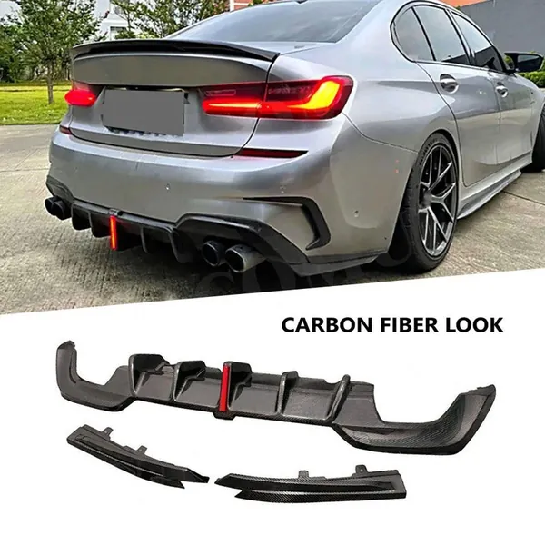 COMPATIBLE WITH BMW 3 SERIES G20 2019-2022 M SPORT REAR BUMPER DIFFUSER AFTER LIP SPLITTER SKIRS VTEN STYLE WITH LIGHT CARBON FIBER LOOK