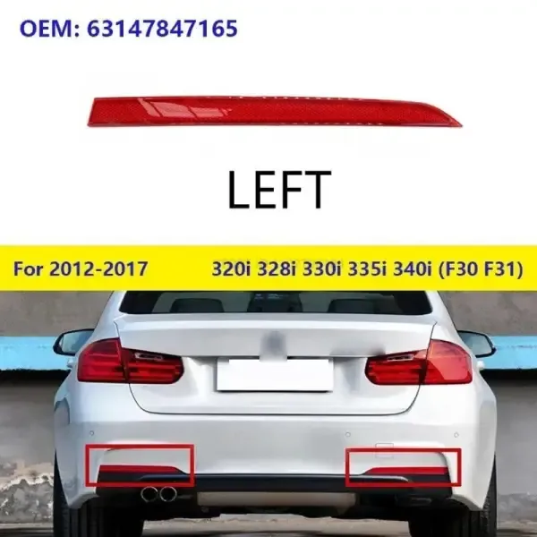 COMPATIBLE WITH BMW 3 SERIES F30 2012-2018 M SPORTS M3 REAR BUMPER REFLECTOR LIGHT RED LENS 63147847165 KL LEFT