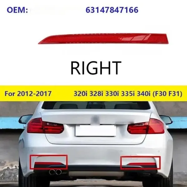 COMPATIBLE WITH BMW 3 SERIES F30 2012-2018 M SPORTS M3 REAR BUMPER REFLECTOR LIGHT RED LENS 63147847166 KL M3 RIGHT