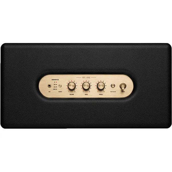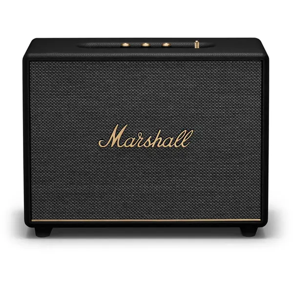 Fill your space with the reengineered sound of the Marshall 150W Woburn III Wireless Home Bluetooth Speaker in black. The newly angled tweeters of this third-generation Woburn help the 3-way system offer a wider soundstage, along with improved midrange clarity and controlled, deep bass. It's the rock 'n' roll home speaker that looks and sounds the part. Standing out from the crowd, the Woburn III puts Marshall's signature style front and center. Looking like one of their iconic amps, the speaker sports the traditional cabinet design, brass control knobs, black exterior, mesh grille, and Marshall script emblem at the center. You can utilize the Woburn III in almost any room—Bluetooth, RCA, 3.5mm, and HDMI inputs let you stream music, watch TV, and play games in style.