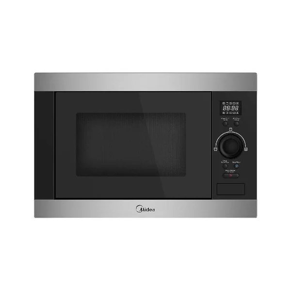 The Midea AG925BVE-SS is a compact, fully built-in 25L microwave oven with a sleek Inox (Silver Black) finish. It combines manual knob controls with an LED display, offering versatile cooking with 5 power levels, a 1000W grill function, and 8 convenient preset AutoPrograms for effortless meal preparation.