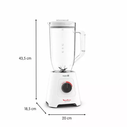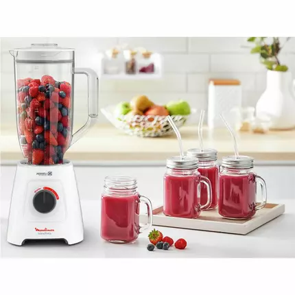 ULTRA-HIGH CAPACITY: This blender comes with a unique, patented and generous XXL plastic jar (2.8 L) to blend large quantities in a single go POWERFUL PERFORMANCE: 600 W of power and 6 Powelix blades for perfect, chunk-free results SAFE and EASY TO CLEAN: Smooth plastic jar and smart lock system for safe blade removal and easy cleaning ICE CRUSH TECHNOLOGY: A powerful blender with a worry-free ice crush function that won't overburden the motor or damage the jar VERSATILE BLENDING: 2 speeds along with a pulse function and grinder and chopper accessories to prepare a variety of different recipes with ease MOULINEX BLENDER: This blender mixer will offer one of the biggest jar capacity in the market, 2.8 L total Versatile Blending This blender will offer one of the biggest jar capacities in the market, 2.8 L total! This will allow blending large quantities for the whole family. It also comes with a 100% leak free smart lock 3-point system That is easy to clean, sfa eto use and patented. Finally, the blender comes with 2 speeds along with a pulse function and grinder and chopper as accessories to prepare a variety of recipes. PRODUCT BENEFITS Ultra-high capacity Blendforce XXL blender is equipped with a generous plastic jar to blend large quantities of all your daily recipes in a single go—perfect for the whole family. Safe and Easy to clean Removable Blades that can be removed and cleaned very easily Powerful engine 600 watts engine that will help your blend any ingredients ensuring the best end result Powelix blades to crush ice 6 powelix blendes that will enable you to crush ice 50% faster