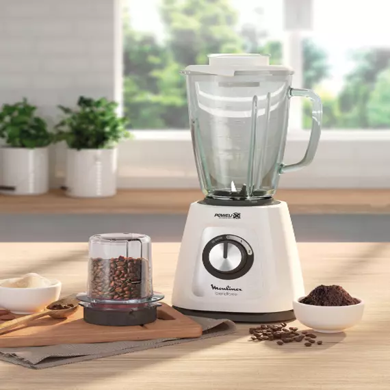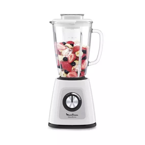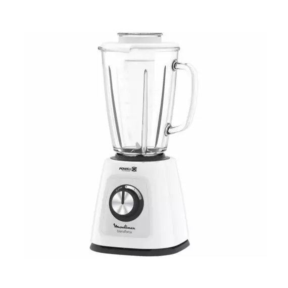 Blendforce delivers power, performance with the Powelix Technology. One aim: to reach the perfection faster! With a large capacity thermal shock resistant glass jar and an innovative Air Cooling System for optimum motor durability, this blender provides a powerful motor, safety features with the Smart Lock Technology and an ergonomic design for increased efficiency and ease-of-use. Features : POWELIX TECHNOLOGY Amplify the mixing power up to 30% faster* OPTIMAL DURABILITY Optimized blades cutting angle for maximum resistance even on hardest ingredients OPTIMAL CUTTING PERFORMANCE Extremely sharpened blades for incredible smothness OPTIMAL VORTEX Advanced geometry of blades for an homogeneous texture Large capacity glass jar A 1,75 L thermal shock resistant glass jug (up to 80°C) Air Cooling System Innovative Air Cooling System for optimum motor durability thanks to the air flow. You can have up to 3 minutes of continuous blending. Smart Lock Smart lock for effortless daily blending ACTION 1 : EASY LOCK New external locking for more comfortable closing ACTION 2 : EASY SAFETY New safe auto lock system on the base to have the blades perfectly secure when you lock the jar. ACTION 3 : EASY CLEAN New clic clean to split the blade holder in 2 parts for an easy cleaning. Ultimate blending results with full control with the ideal format Ergonomic rotary button: 2 speeds and a pulse fuction to adapt different recipes and textures and choose the timing you want. A textured grip around the function dial, an ergonomic handle, and recessed controls ensure maximum comfort and ease-of-use with a clean, modern look, with three speeds to customize blending results. Grinder Grinder to grind all your spices, coffee beans, dried fruits as almonds, nuts, etc. Chopper To chop easily your onion, garlic, herbs, etc. Technical Details : Power : 700 W Blades Technology : Powelix blades = 30% faster Jar total capacity : 1.75 L Jar material : Glass Number of blades : 6 Removable blades : Yes Colours : White Additional included accessories : Chopper grinder Jar useful capacity : 1.25 L Speed settings : 2 Ice crush function : Yes Suction feet for stability : Yes Dosing cup : Yes Dishwasher safe : Yes Dishwasher safe - details : Jar without blades + lid + dosing cup Cord Storage : Yes Dimensions (D x W x H) : 200 x 173 x 404 (mm) Weight : 3.595 (KG)