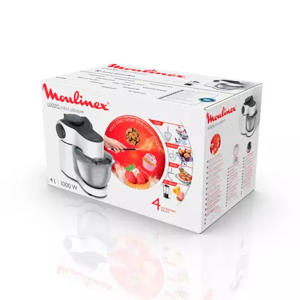 Wizzo will simplify your life in the kitchen. With its pastry kit including the Patented Flex Whisk, success isguaranteed every time: cakes, quiches, pizza and other preparations will hold no secret for you. The recipes you’ve always wanted to bake, but never dared to dream will become possible. With the front opening and side command buttons, there is no need to make your head spin moving the product around in all directions. Wizzo knows how to make itself fit in any kitchen, and the flat rear design means Wizzo will fit neatly wherever you keep it. With Wizzo by your side you'll surprise yourself! Features : Surprise yourself with Wizzo! Real talent is knowing how to be accompanied, to give yourself a helping hand to reveal your cooking potential. Wizzo means "magical and practical" and is designed to simplify your life in the kitchen. Once you get going, your new discoveries will just keep on coming Egg whites in 60 seconds! The unique and patented Flex Whisk Technology whisks egg whites into stiff peaks in no time, even from a single egg. Easy to use, Easy to store Designed for ultimate comfort of use, with all functions facing you for easy access. The front facing design optimises space on your kitchen counter meaning Wizzo will fit neatly wherever you keep Optimal mixing results The planetary movement of the pastry tool and machine head ensures every area of the bowl is reached, for smooth and homogenous mixing results Pastry kit A patented Flex Whisk accessory for light preparations, a plastic beater for pastry dough, and a stainless-steel dough hook for heavy dough. With Wizzo, you’ll be able to prepare all kinds of baked goods! Elegant stainless steel mixing bowl Wizzo features a 4L stainless steel bowl with splashguard, perfect for the entire family. Realize up to 40 cupcakes or 3 pizzas (28cm diameter, with thick crust) to delight your family and friends! Fast and powerful 1000 W and 7 speeds with pulse function, for smooth, even mixing. Increase your baking options Compatible with 4 optional attachments (blender, chopper, meat mincer, shredder/slicer) to meet all your family's needs and tantalise everybody's taste buds. Lacking inspiration? Enjoy 25 recipe ideas! Recipe book available for download on Moulinex website with 25 recipes to discover, from daily snacking to yummy desserts. 1L blender attachment included Mix up fresh fruit smoothies, whip up pancake batter, enjoy hot or cold soups and much more. Technical Details : Power : 1000 W Bowl total capacity : 4L Speed settings : 7 Whisk : Yes Additional included accessories : Blender Recipe book : Yes Pulse function : Yes Planetary movement : Yes Bread dough : 0.8 kg Cake dough : 2.7 kg Bowl material : Stainless steel Blender : Yes Blender total capacity : 1L Beater : Yes Dough Hook : Yes Colours : Snow white Dimensions (D x W x H) 300 x 250 x 300 (mm) Weight 4.7 (KG)