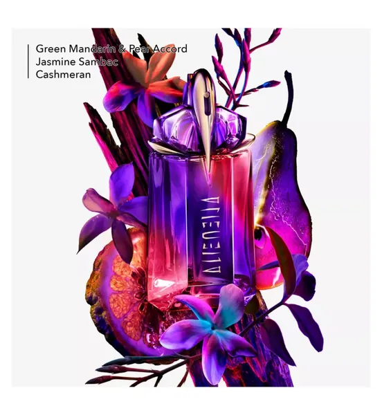 Hypermodern, hyperfeminine, so fiercely floral, Alien Hypersense expresses the quintessence of florality. Alien’s signature jasmine sambac is magnified in the overblooming revelation, boosted by a solar accord of creamy white floral notes. Juicy green mandarin and crisp pear accord brighten the fragrance in the awakening revelation, while the powerful scent of cashmeran jolts the senses in the electrifying revelation.