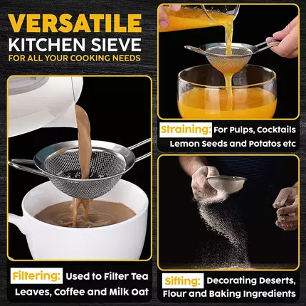 • USE - Our fine siever can be used for straining tea, coffee or sifting sugar, spices, flour, sugar, spices, rice, cocoa powder etc.