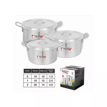 Cookware Set– It’s the ideal baking surface. Our ‘Safe-Seal’ anodizing process creates a safer, stronger cooking pot. A durable, non-reactive finish that cooks a wider variety of recipes, including citrus-based and savory recipes. Freezer safe. HEATS & COOLS QUICKER – By reflecting heat, rather than absorbing heat, sonex cooking pot reach cooking temperatures faster. Even heating allows for the best possible rise. NO EXTRA METALS OR CHEMICAL COATINGS – Anodizing is not a coating. It is an environmentally-friendly process that contains no chemical additives, dyes, PTFE’s or PFOA’s. Nothing that can transfer, peel, flake or rust into your cooking 3 Pieces in a set 1.5L 2.5L 4L METERIAL Body: Aluminum Handle: Handle Dimension 16 cm 18 cm 20 cm Nadstar8 Cookware Set 3Pcs Set With Lid & Handle Metal Finish Sufuria from Nidadanish. Get it delivered at your doorstep.