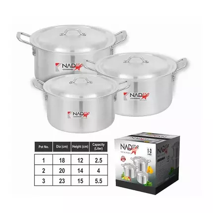 Cookware Set– It’s the ideal baking surface. Our ‘Safe-Seal’ anodizing process creates a safer, stronger cooking pot. A durable, non-reactive finish that cooks a wider variety of recipes, including citrus-based and savory recipes. Freezer safe. HEATS & COOLS QUICKER – By reflecting heat, rather than absorbing heat, sonex cooking pot reach cooking temperatures faster. Even heating allows for the best possible rise. NO EXTRA METALS OR CHEMICAL COATINGS – Anodizing is not a coating. It is an environmentally-friendly process that contains no chemical additives, dyes, PTFE’s or PFOA’s. Nothing that can transfer, peel, flake or rust into your cooking 3 Pieces in a set 2.5L 4L 5L METERIAL Body: Aluminum Handle: Handle Dimension 18 cm 20 cm 23 cm Nadstar8 Cookware Set 3Pcs Set With Lid & Handle Metal Finish Sufuria from Nidadanish. Get it delivered at your doorstep.