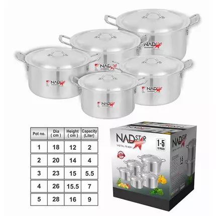 Cookware Set– It’s the ideal baking surface. Our ‘Safe-Seal’ anodizing process creates a safer, stronger cooking pot. A durable, non-reactive finish that cooks a wider variety of recipes, including citrus-based and savory recipes. Freezer safe. HEATS & COOLS QUICKER – By reflecting heat, rather than absorbing heat, sonex cooking pot reach cooking temperatures faster. Even heating allows for the best possible rise. NO EXTRA METALS OR CHEMICAL COATINGS – Anodizing is not a coating. It is an environmentally-friendly process that contains no chemical additives, dyes, PTFE’s or PFOA’s. Nothing that can transfer, peel, flake or rust into your cooking 5 Pieces in a set 2L 4L 5.5L 7L 9L METERIAL Body: Aluminum Handle: Handle Dimension 18 cm 20 cm 23 cm 26 cm 28 cm Nadstar8 Cookware Set 5Pcs Set With Lid & Handle Metal Finish Sufuria from Nidadanish. Get it delivered at your doorstep.