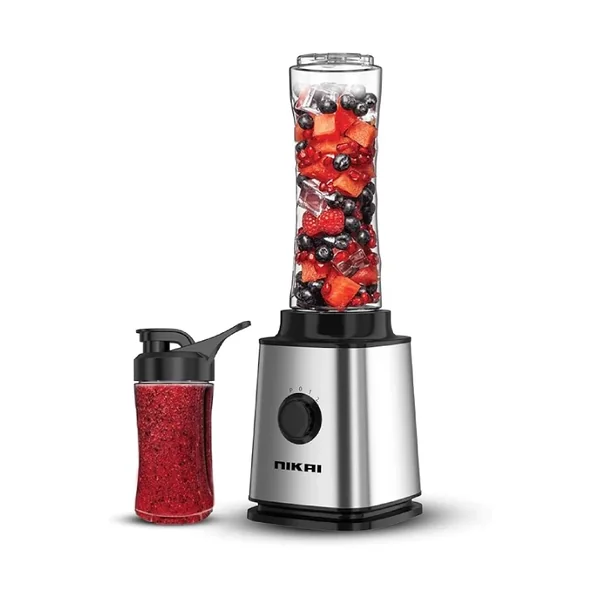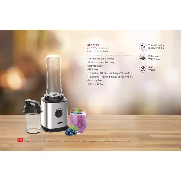 The Nikai NB202ST Smoothie Maker is a compact and powerful 300W appliance designed for effortless blending. It comes complete with two BPA-free Tritan bottles for portability, durable stainless steel blades, and a sleek design, making it ideal for creating smoothies, shakes, and more in any kitchen.