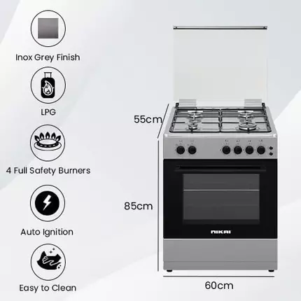 Add a touch of style to your cooking space with the Nikai Freestanding Cooking Range. It is made with the best quality, providing flawless performance. Nikai Free Standing Cooking Range is great for every kitchen that values cooking with ease. You can cook more than one meal at a time, with the help of both the gas burners and the oven. Materials used to build this range are timeless and always suitable for your decor. Easy to integrate into your cooking space, this range is for those who prefer cooking faster. The cooking range has four gas burners, a gas oven, Flame-Failure Device for safety to prevent accidental gas leakages, matt enamel pan supports so pans don't slip off, six knobs for control, a glass lid for the burners, a double glass oven door for proper insulation, an adjustable thermostat, oven lamp, auto cooling fan to stop overheating, turnspit so the meat is cooked thoroughly, one tray and grid for using in the oven, a grilling option, a stainless steel top for stability and because it is a material that can withstand heat and an inox grey body. Key Feature Specifications: 60×55 freestanding gas cooker 4 gas burner with FFD Lamp With turnspit With 1 tray 1 grid Made in Turkey