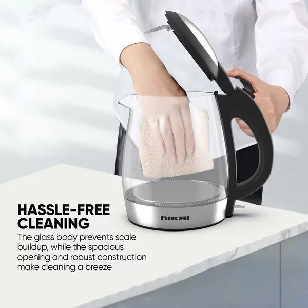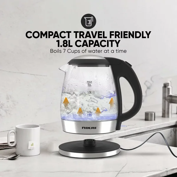 The Nikai NK303G is a compact, cordless electric glass kettle featuring a 1.2L capacity and powerful 2200W heating for rapid boiling. Its sleek glass design combines modern style with practical features like automatic shut-off and boil-dry protection for safe, convenient use.