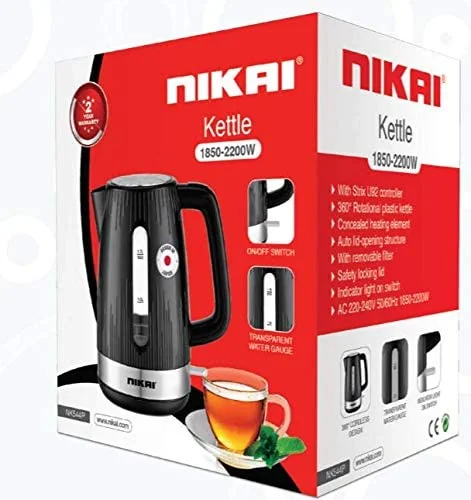 The Nikai NK544P is a powerful 2200W cordless kettle featuring a 1.7L capacity, a sleek black design, and the reliable Strix U92 controller for safe and efficient boiling.