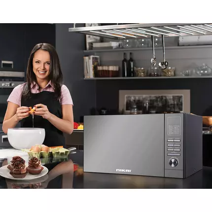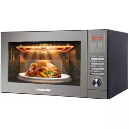Cooking meals is not a task anymore! The Nikai Microwave Oven with 25 Liter capacity and sleek mirror finish lets you cook for your whole family. There is an auto menu with ten options which gives you easy operation. It has a twist knob for setting the timer and cooking power. It has a defrost setting that lets you thaw fish, chicken, and other meat without actually cooking it by reducing the heat to almost 30%. The microwave has a pull door for ease of use and an indicator bell that goes off at the end of the cooking process. Key Feature Press "Microwave" and the LED display "P100". Press "Microwave" for the times of turning the knob "to choose the power you want, and "P100". "P80". "P50", "P30" or "P10" will display for each added press. Then press "Start/+30 Sec/Confirm" to confirm and set the time accordingly to cook. Press "Grill/Combi" the LED will display "G", and press "Grill/Combi" for times or turn the knob to choose the power you want, and "G", "C-1" or "C-2" will display for each added press. Then press "Start/+30 Sec/Confirm" to confirm and set the time accordingly to cook. At most 2 sections can be set for cooking. In multi-section cooking, if one section is defrosting, then defrosting shall be placed in the first section. Feature Digital control Mirror finish 5 power levels 10 Auto menus Defrost setting Cooking end signal Push button door Child safety lock With grill Power: 900W Specifications: Brand Name: Nikai Model: NMO250MDG Product Dimensions: 36 x 58 x 46 cm; 17.5 Kilograms Energy Use: 900 Watts Capacity: 25 Liters Installation Type: Countertop Special Features: Timer, Defrost Color: Black Voltage: 220 Wattage: 50 Defrost: Defrost Door Hinges: Left Included Components: Microwave