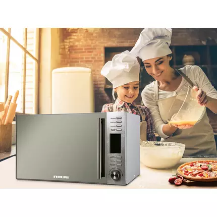 Nikai Microwave Oven With Grill 30L Digital Mirror finish Digital control Defrost by timing and weight Cooking end signal Child safety lock Pull handle door With grill Stainless steel panel Power: 1100W Key Feature Press "Microwave" and the LED display "P100". Press "Microwave" for the times of turning the knob "to choose the power you want, and "P100". "P80". "P50", "P30" or "P10" will display for each added press. Then press "Start/+30 Sec/Confirm" to confirm and set the time accordingly to cook. Press "Grill/Combi" the LED will display "G", and press "Grill/Combi" for times or turn the knob to choose the power you want, and "G", "C-1" or "C-2" will display for each added press. Then press "Start/+30 Sec/Confirm" to confirm and set the time accordingly to cook. At most 2 sections can be set for cooking. In multi-section cooking, if one section is defrosting, then defrosting shall be placed in the first section.