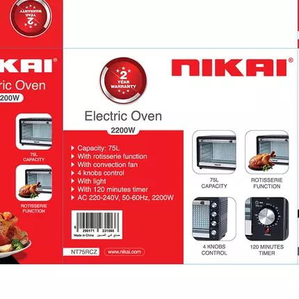 120 minutes timer with Stay On. Specifications: 40 LITRE CAPACITY ELECTRIC OVEN With rotisserie Inner Light 3 knobs control With selector & timer Power: 1800W Accessories - Bake Tray, Wire Rack, Tray Handle Rotisserie Set AC 220-240V 50-60hz 1500w