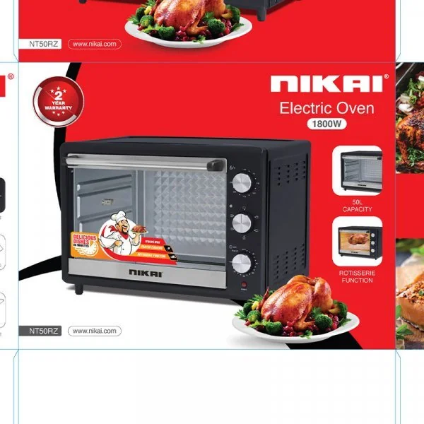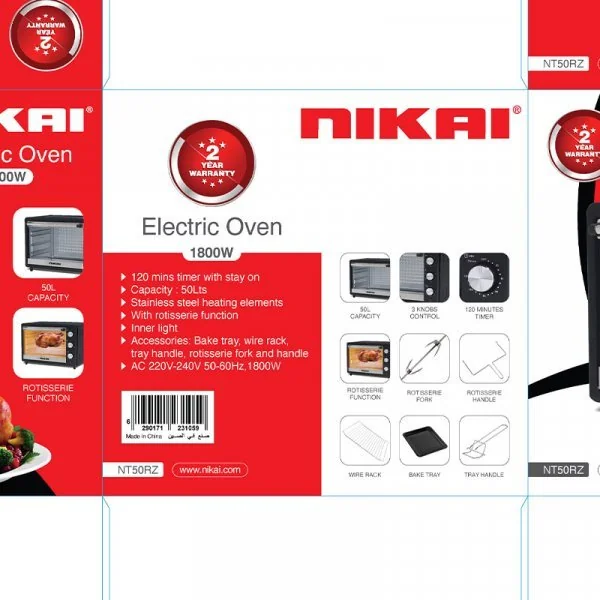 The Nikai NT50RZ is a versatile 50-liter electric oven featuring a powerful 1800W system with four stainless steel heating elements and a convenient rotisserie function, perfect for roasting and baking.