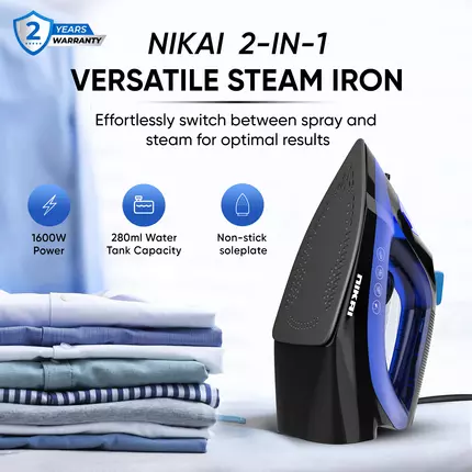 Nikai Steam Iron 1600W 280ml Self-Cleaning Function, Non-Stick Soleplate, Vertical Steam Dry & Spray Options, Adjustable Temp, Indicator Light Variable Steam Control NSI858AX