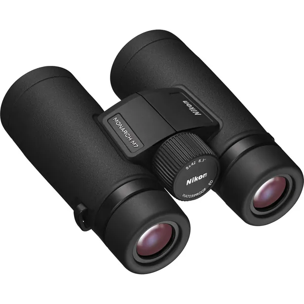 Boasting a wide viewing angle that presents an immersive viewing experience, Nikon's black 8x42 Monarch M7 Binoculars have improved design features compared to previous iterations, with the same focus on comfort and performance the line is known for. Featuring extra-low dispersion glass elements with anti-reflection fully multicoated optics and highly reflective dielectric-coated, phase-corrected roof prisms, complemented by exterior lens coatings that repel water and oil, the Monarch M7 produces bright and clear high-contrast images with true-to-life color and minimal color fringing.