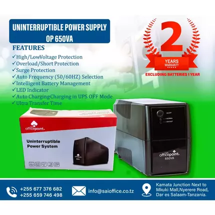 OFFICE POINT 650VA UPS (2-YEARS WARRANTY, Excluding Battery 1 year) Specifications: 650VA/360W Topology: Line interactive High/Low Voltage Protection Overload/sort Protection Surge Protection Auto Frequency (50/60hz) Selection Intelligent Battery Management Led Indicator Auto Charging - Charging In Ups Off Mode Ultra Transfer Time, (Overload -about Shutdown) Internal Protection Module With External Fuse UPS 650VA The backup power supply provides guaranteed power for desktop computers, wireless networks, gaming consoles and other electronics. Battery backup surge protector provides power during outages and unsafe voltage fluctuations, as well as protection from damaging surges and spikes. Power backup with PowerChute software and automatic shutdown.