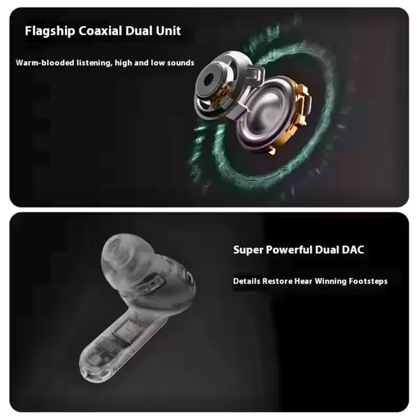 Driver unit: equipped with 11mm+6mm ultra-clear integrated coaxial dual units, with an 11mm dynamic unit responsible for low frequency and a 6mm dynamic unit responsible for high frequency. The dual units are coaxially arranged, and each sound unit is independently driven by a decoding chip, which can present clearer sound details, rich bass and transparent high pitch.
