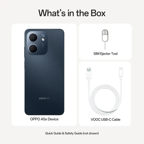 The OPPO A5x is engineered for adventure, combining robust durability with powerful performance. With IP65 water and dust resistance and military-grade shock protection, it’s built to handle life’s unexpected moments. A massive 6000mAh battery and 45W SUPERVOOCTM Flash Charge keep you powered up all day long. Experience crystal-clear visuals in any lighting condition thanks to the ultra-bright 1000-nit display. The OPPO A5x is the perfect blend of toughness, endurance, and brilliance, ready for what life throws at you!