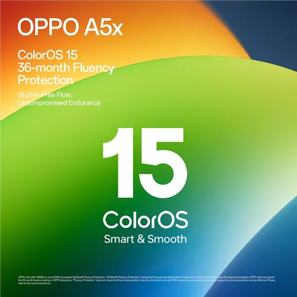 11. OPPO A5x with 128GB or more ROM has passed 36-Month Fluency Protection. "36-Month Fluency Protection" means that through the optimisation of software, hardware and other comprehensive technologies, OPPO A5x has passed the 36-month fluency testing in OPPO laboratory. "Fluency Protection" does not mean that there is absolutely no lag. Due to factors such as ROM, network environment and personal usage, the actual experience may be different. Please refer to the actual experience.
