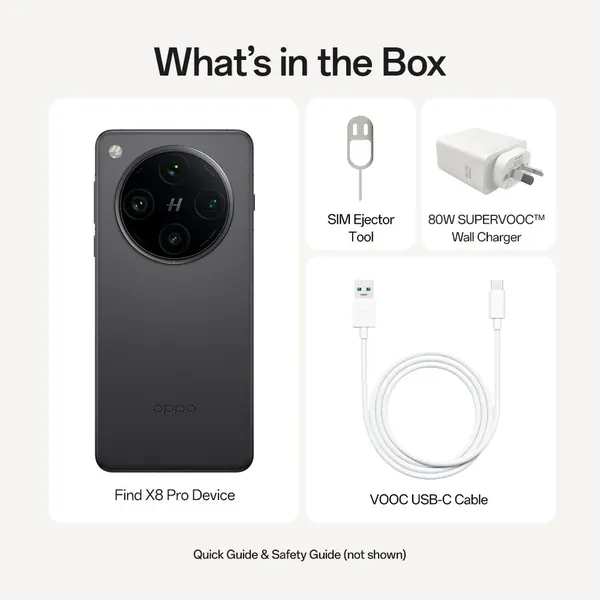 The OPPO Find X8 Pro delivers a groundbreaking smartphone experience, merging premium photography, advanced AI, and sleek design. Pushing the limits of smartphone photography with its HyperTone Quad Main Camera System, it offers incredible detail and colour across a 0.6x to 120x zoom range. Powered by the Trinity Engine and Dimensity 9400, the OPPO Find X8 Pro ensures ultra-fast, stable performance. Enjoy long-lasting battery life with the 5910mAh OPPO Silicon-carbon Battery, 80W SUPERVOOC™, and 50W AIRVOOC™ charging. With 4K 60fps Dolby Vision recording on all cameras, this sleek, lightweight device combines powerful AI, stunning visuals, and seamless usability in one.