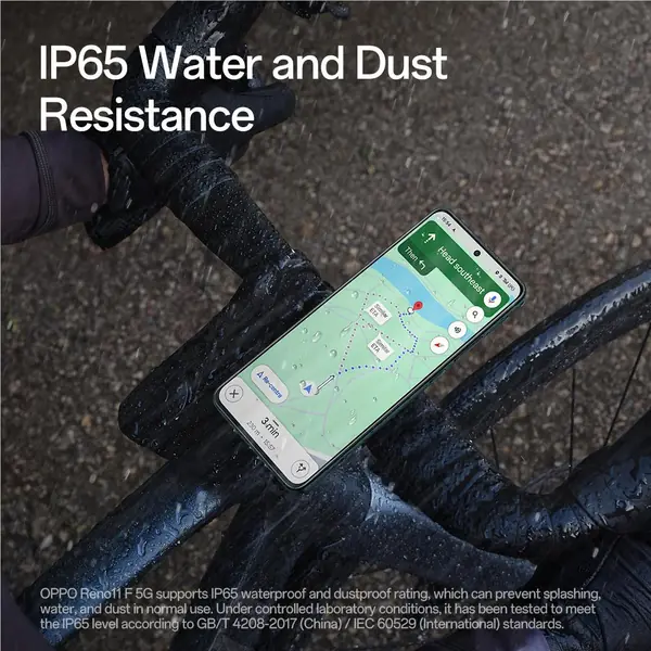 3. OPPO Reno11 F 5G supports IP65 waterproof and dustproof rating, which can prevent splashing, water, and dust in normal use. Under controlled laboratory conditions, it has been tested to meet the IP65 level according to GB/T 4208-2017 (China) / IEC 60529 (International) standards. The IP65 waterproof conditions are as follows: (1) Nozzle inner diameter 6.3mm, distance 2.5-3m, water flow rate 12.5L/min; (2) Test time not less than 3 minutes; (3) Water temperature should not differ from the product temperature by more than 5℃. The splash-proof, waterproof, and dustproof functions may decrease due to daily wear and tear. Please do not charge the phone in a damp state. Damage caused by immersion in liquids is not covered by the warranty.