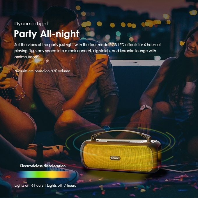 The oraimo Boom comes with a 3.5mm audio cable, USB charging cable, and user manual. The speaker is available in black and red colors. With its compact size, powerful sound, and dynamic light effects, the oraimo Boom is the perfect speaker for music lovers on the go. Whether you're hosting a party, enjoying a day at the beach, or simply relaxing at home, the Boom delivers an immersive audio experience that will keep you entertained for hours.