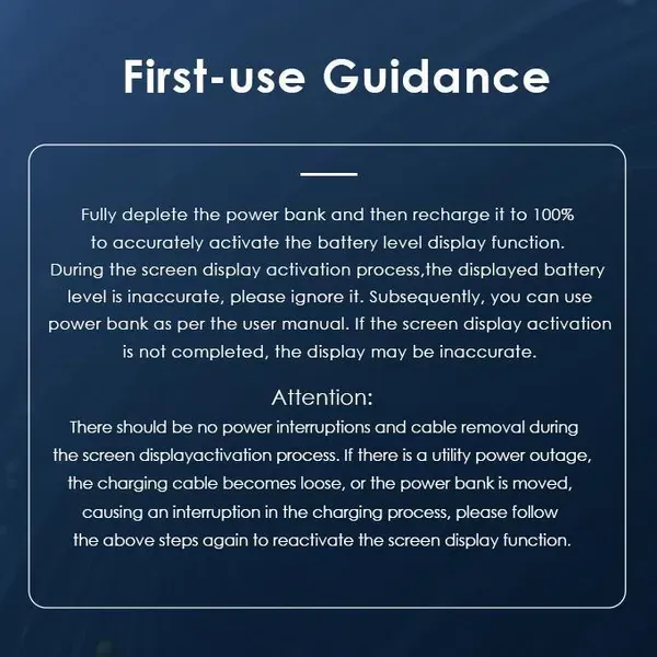 Fully deplete the power bank and then recharge it to 100% to accurately activate the battery level display function. During the screen display activation process, the displayed battery level is inaccurate, please ignore it. Subsequently, you can use power bank as per the user manual.