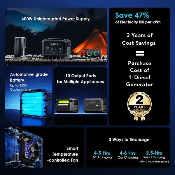 Whether you harness the sun's power through solar, plug into AC, or charge in your car, oraimo PowerStation 600 is ready to adapt to your needs on the go.