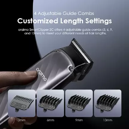 Key Features: Super Powerful Motor Strong Motor, Slick Haircut Powered by 6000 RPM strong motor, it is suitable for all hair types. Enjoy smooth, snag-free performance for an easy, slick haircut! Adjustable to Zero Gap Precise Hair-cutting oraimo SmartClipper 2C is designed with a zero-gap adjustment that allows for precise lining and edging with a simple turn of the taper lever. Four Guide Combs Customized Length Settings oraimo SmartClipper 2C offers 4 adjustable guide combs (3, 6, 9, and 13mm) to meet your different needs of hair lengths. Stainless Steel Blade Sharp & Fast Sharp stainless steel blades effortlessly manage coarse hair, providing you with swift and efficient hair-cutting. Long Run Time Long-lasting Performance The 2000mAh high-capacity battery provides 2.5 hours of running time. During your hair-cutting, there's no need to recharge. What's In the Box? Hair Clipper x 1 Guide Comb x 4 (3mm, 6mm, 9mm, 13mm) Brush x 1 Type-C Cable x 1 Lubricant Oil x 1 Welcome Guide x 1 Features: Super Powerful Motor 2.5 hrs Runtime Stainless Steel Blade Precise Blades for All Hair Types Specifications: Brand: Oraimo Model: OPC-CL30C Type: Hair Clipper Material: PC+ABS Size: 195×54×42.5mm Fixed Blade: 46×38.5×4.5mm Moving Blade: 40×22×2.9mm Battery: 3.7V 2000mAh Charging Time: 3.5 Hours Full Working time: 2.5 Hours Guide combs: 4 sizes (3mm,6mm,9mm,13mm)