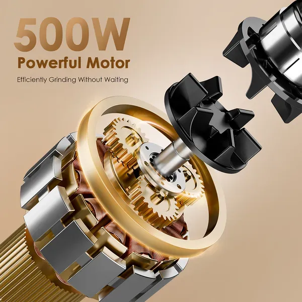 The 500W strong motor efficiently grinds a variety of dry foods.