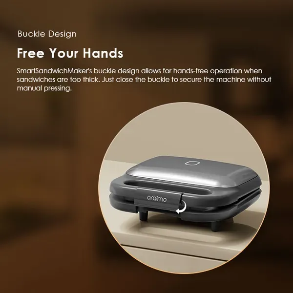 SmartSandwichMaker's buckle design allows for hands-free operation when sandwiches are too thick. Just close the buckle to secure the machine without manual pressing.