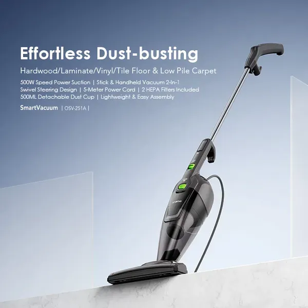 Powered by a 500W strong motor, it delivers high-performance suction of 15.5Kpa, effective on hardwood, laminate, vinyl, tile floors, and low pile carpets, effortlessly remove more.