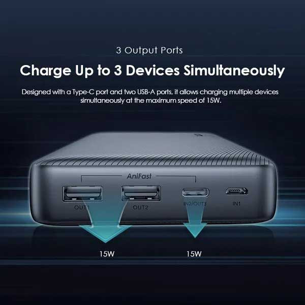 Two USB-A ports and one Type-C port, allowing simultaneous charging of up to three devices.