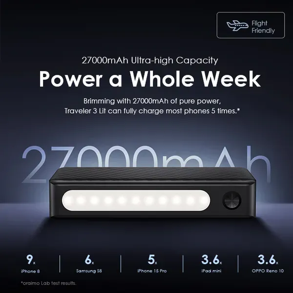 Brimming with 27000mAh of pure power, Traveler 3 Lit can fully charge most phones 5 times.